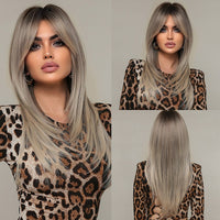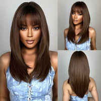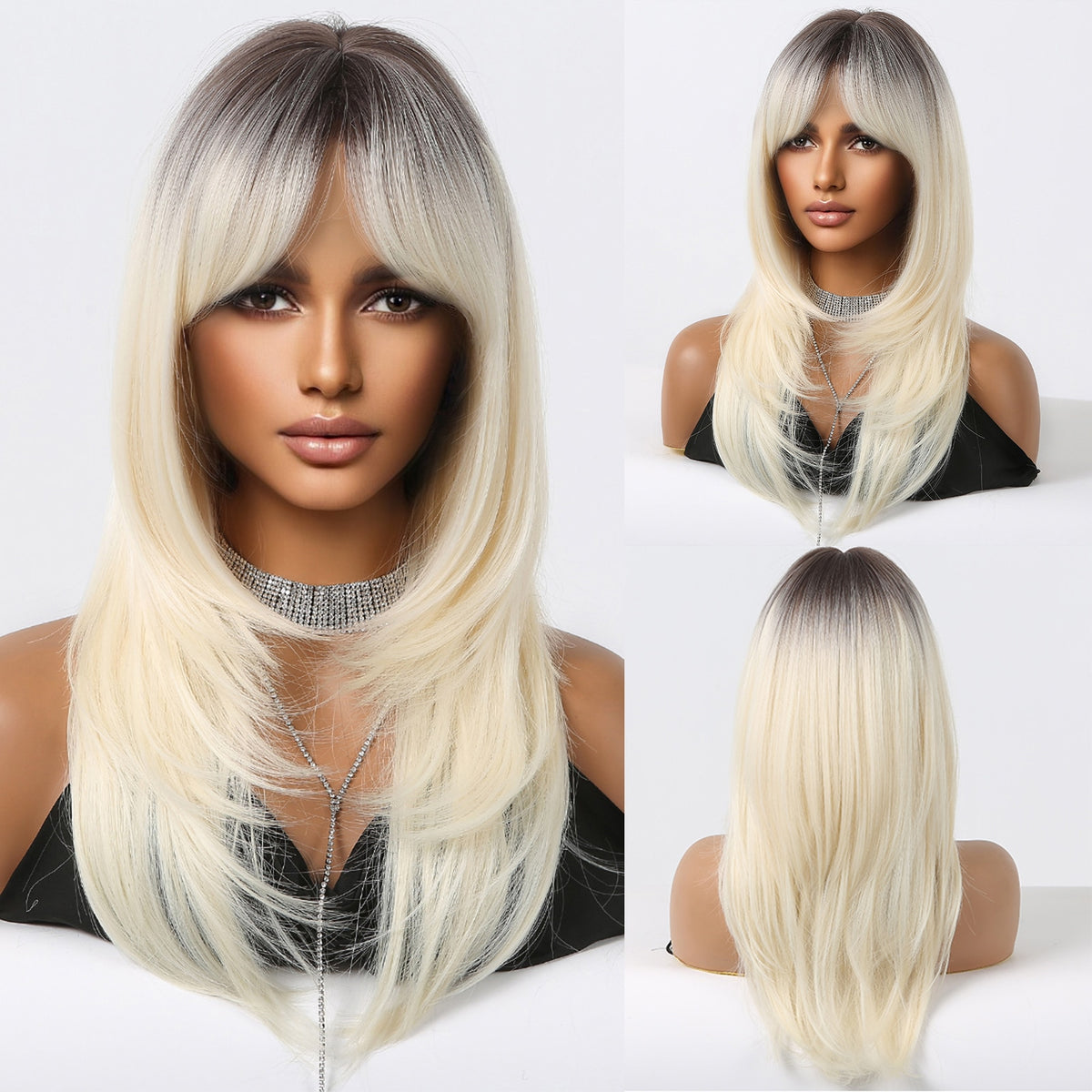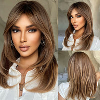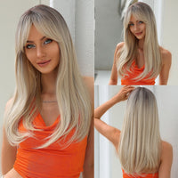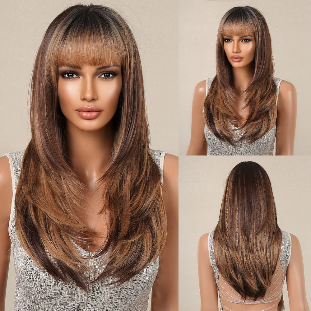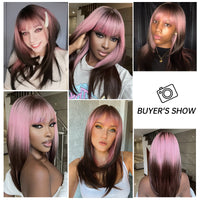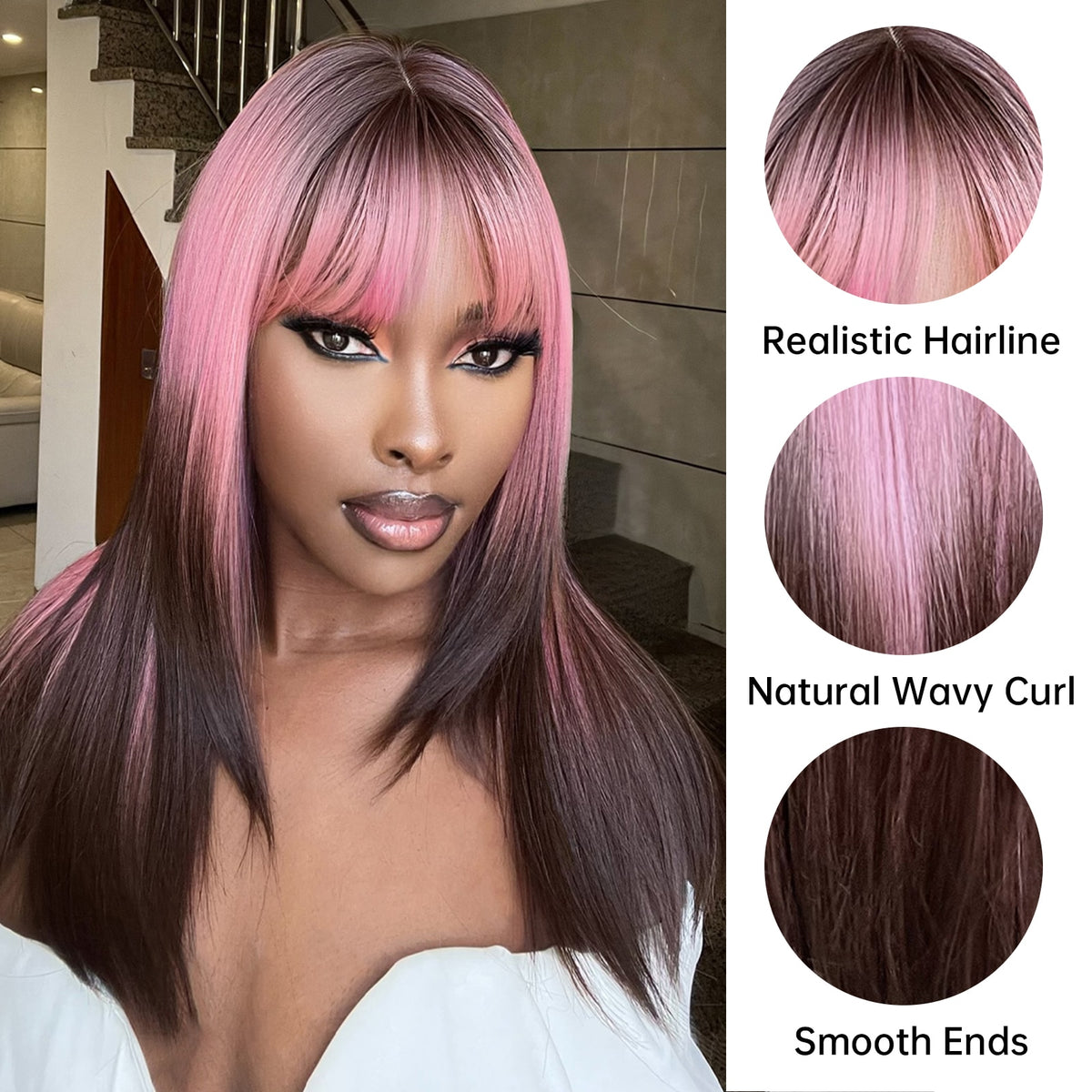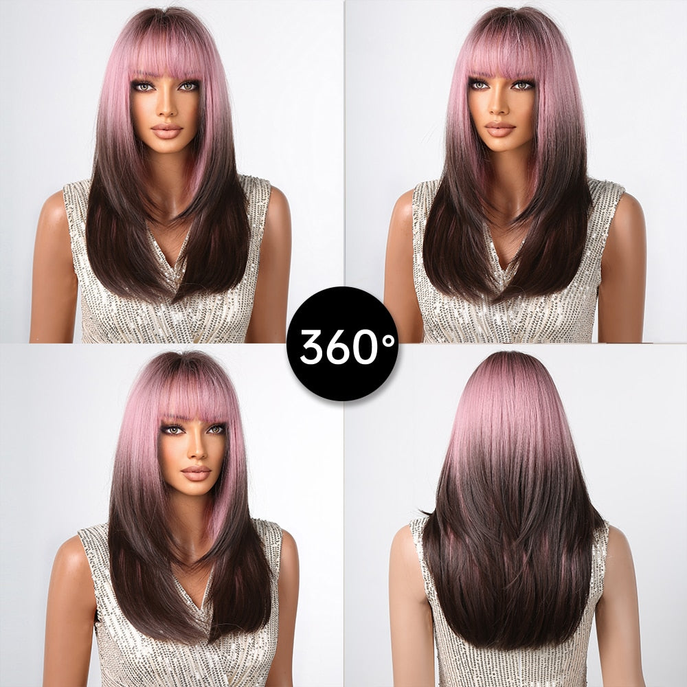 ピンクパープルからブラックオンブルストレートミディアムレングス合成かつら女性のためのバングデイリーコスプレパーティー耐熱ヘアウィッグ
