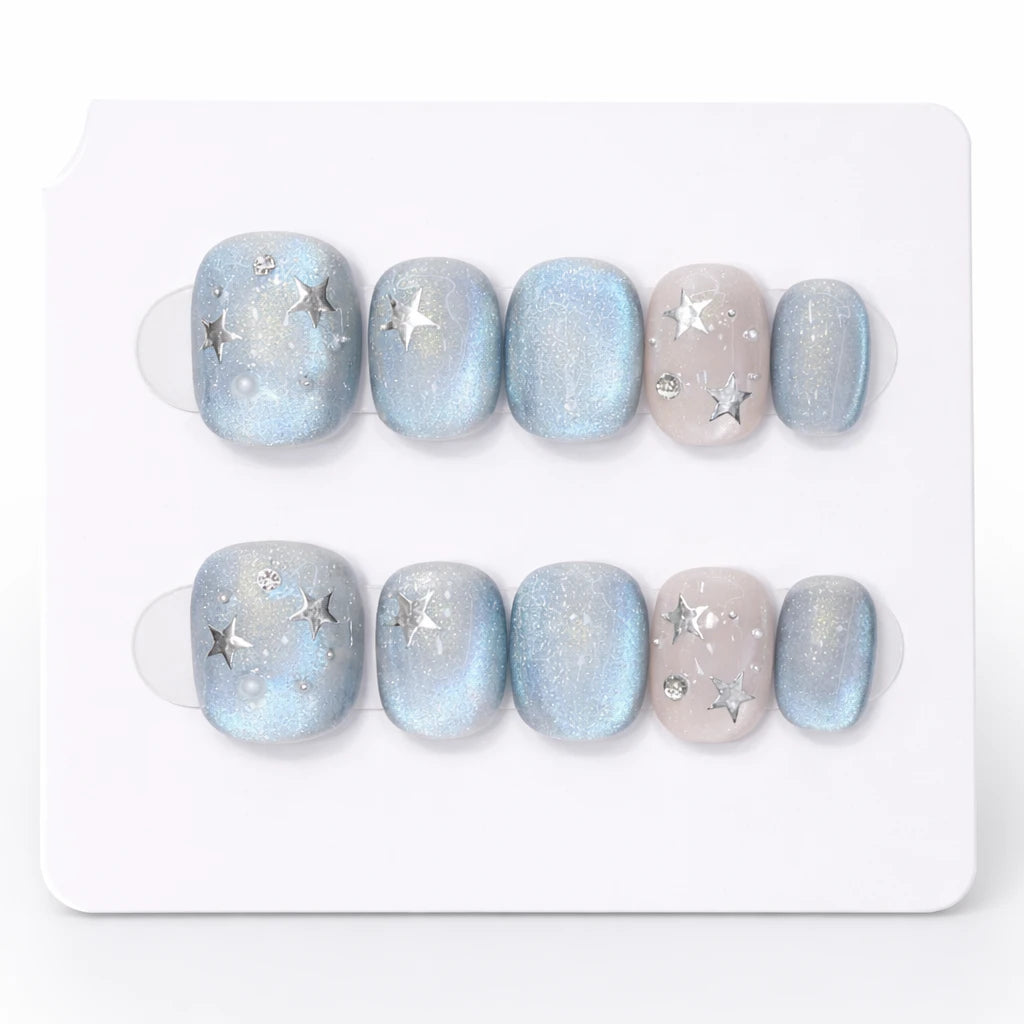 10pcs Sweet Cute Press-On Nails – Blue Nude Short Round Cat Eye False Nails with Butterfly, Shiny Summer Set