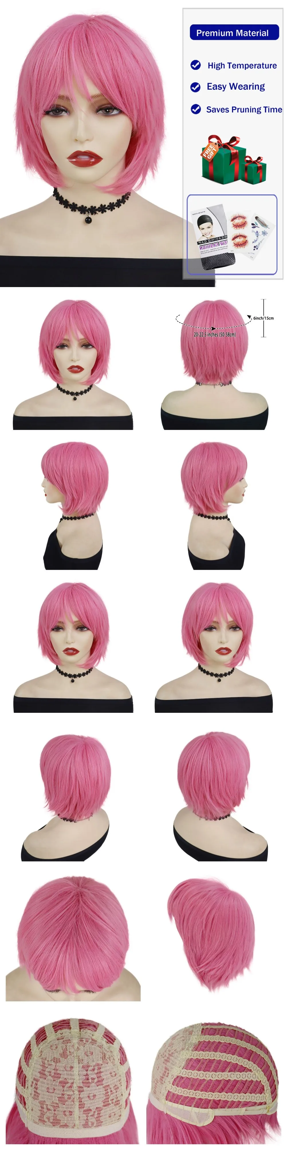 This short pink straight synthetic cosplay wig with bangs offers a clean silhouette and a playful pink tone. The straight texture and fringe create a balanced look suitable for both creative styling and costume wear.
