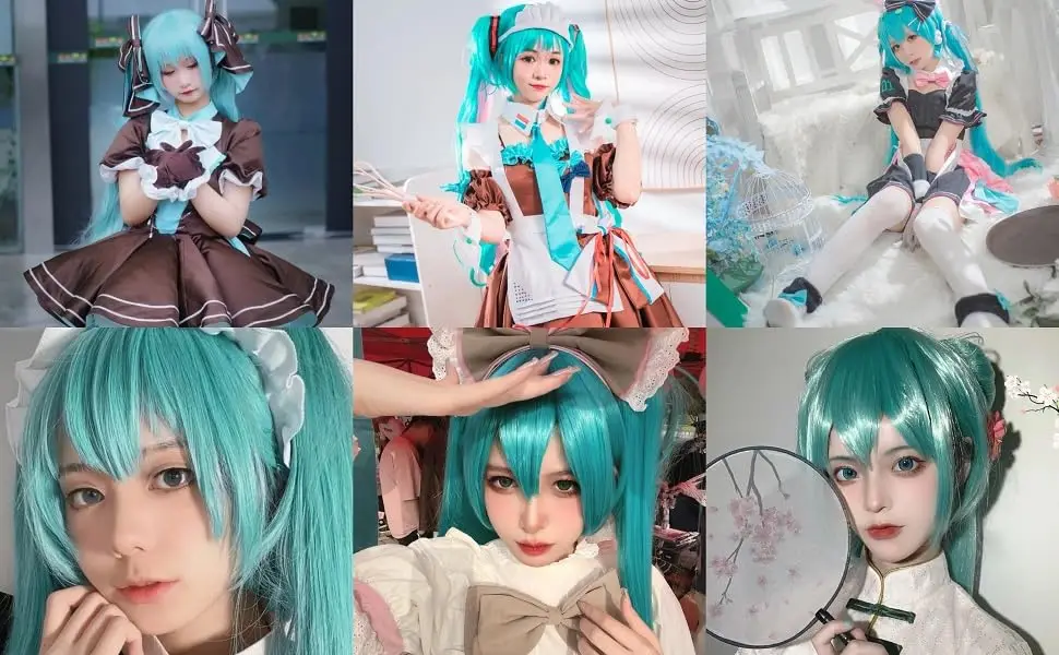 Long teal double ponytails with soft front bangs for a bold and playful cosplay look.