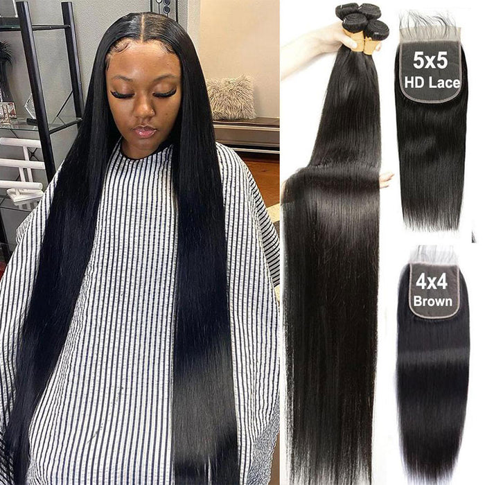 Straight Bundles With 6x6 Lace Closure 36 38 40 Inch Brazilian Hair With Closure Human Hair 3/4 Bundles With Closure Remy Hair